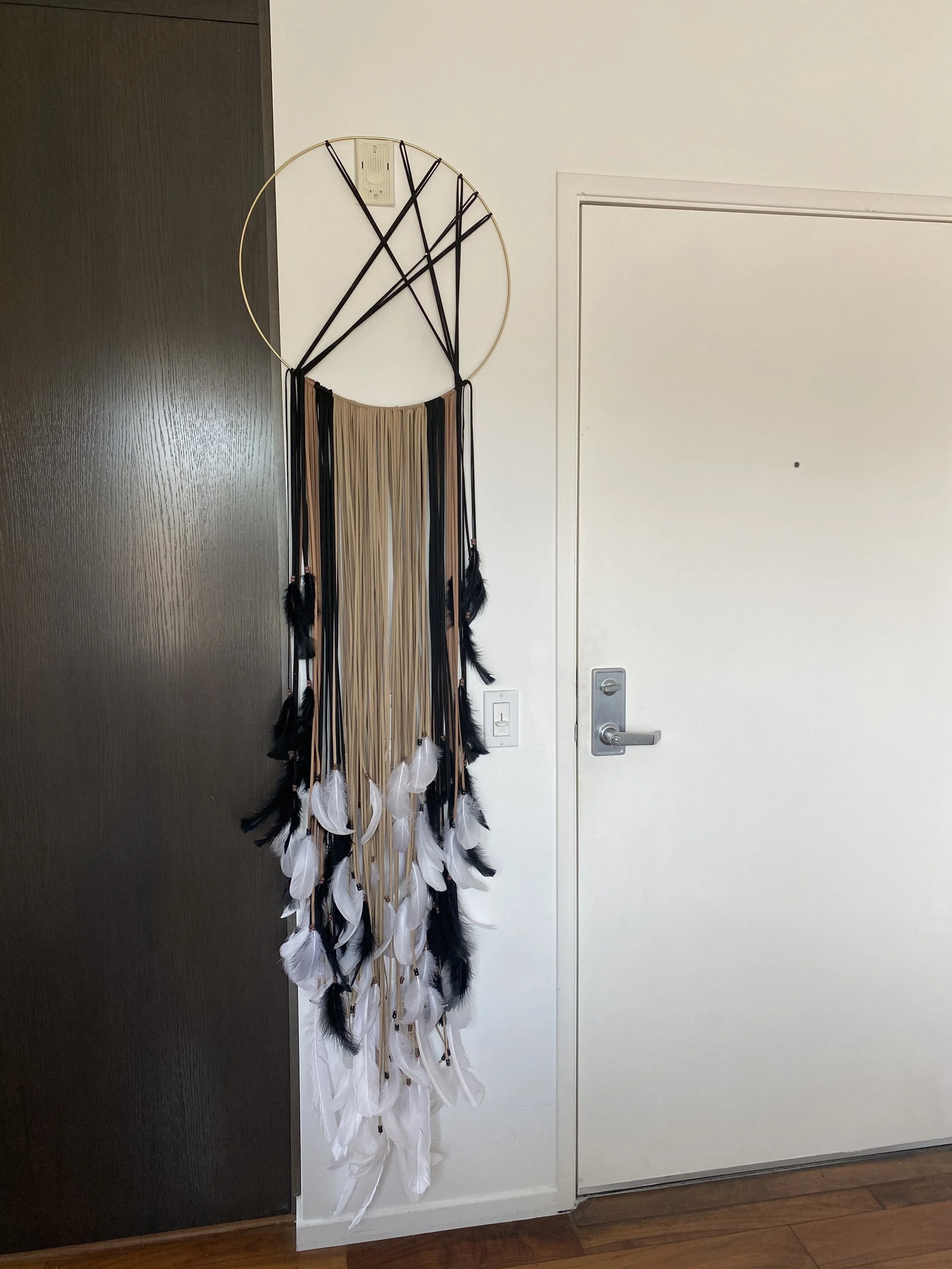 My dear friend Lisa just turned 50 and I knew she wanted a large wall hanging to hang above her staircase in her Brooklyn Heights home. So I started working on this special gift for a special friend back in July. It’s a gold round with faux black cord, brown suede cord with large black and white feathers. I made this one a little different from the others, without sticks or stones and a geometric pattern on the ring for a minimal, modern feel.