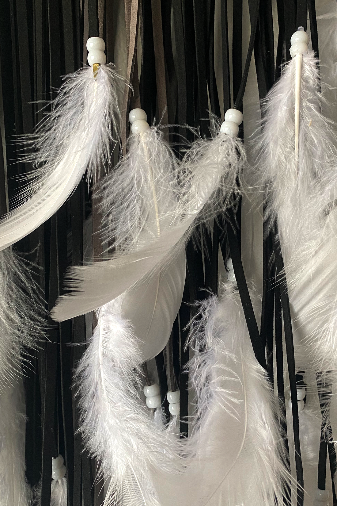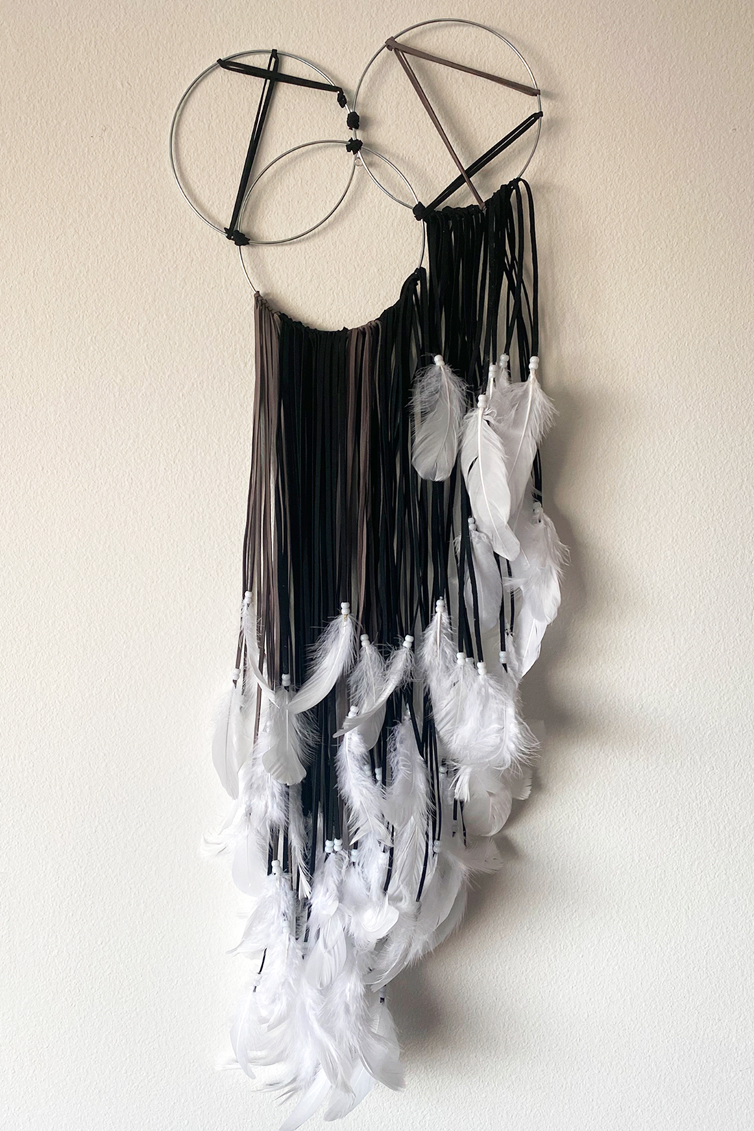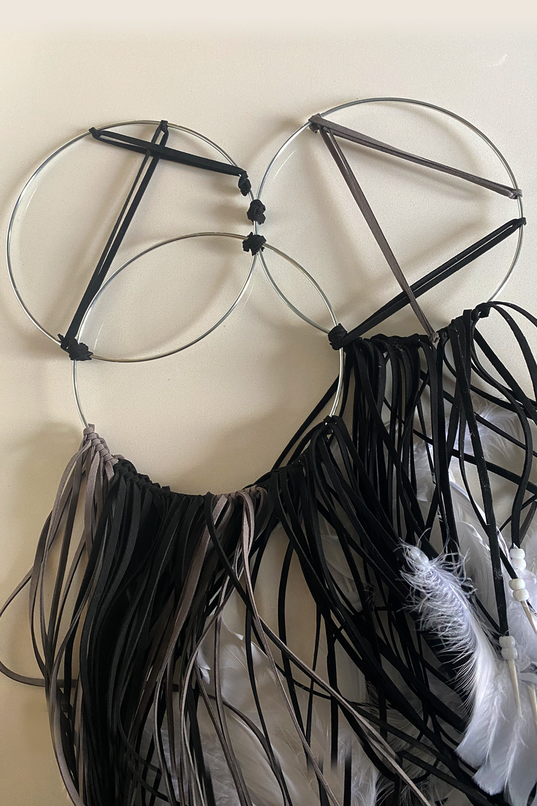 Meet BELLAMY. She’s a unique, modern wall hanging with three 7” diameter silver rings with black and grey faux suede and white feathers. No stones for this gal as the rings can’t handle the weight.