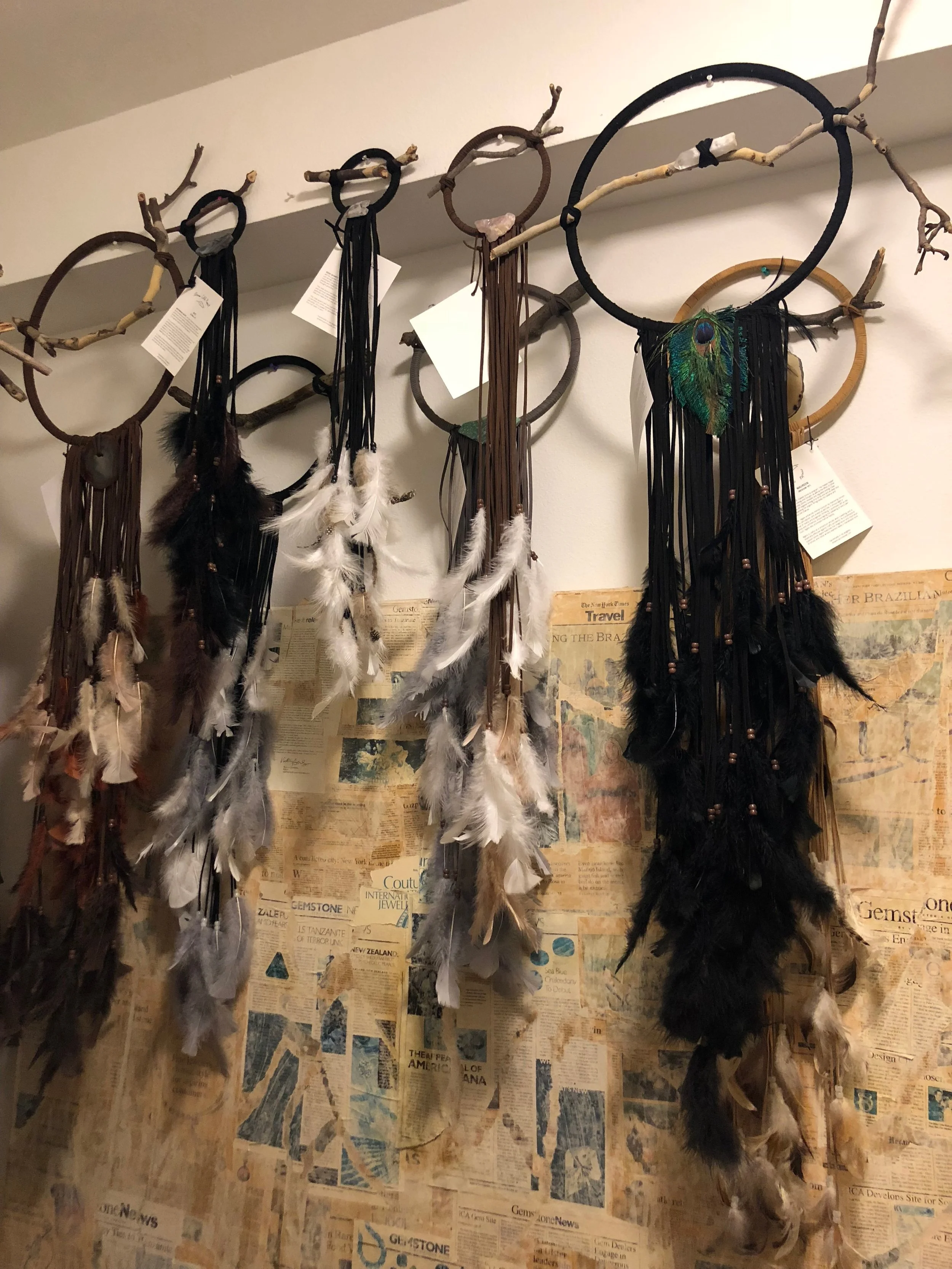 Eight dreamcatchers available in sizes from x-small to large and many dreamcatcher necklaces: beaded wrap, peacock wrap and dreamcatcher necklaces in all colors (light brown, medium brown, white, black, red).