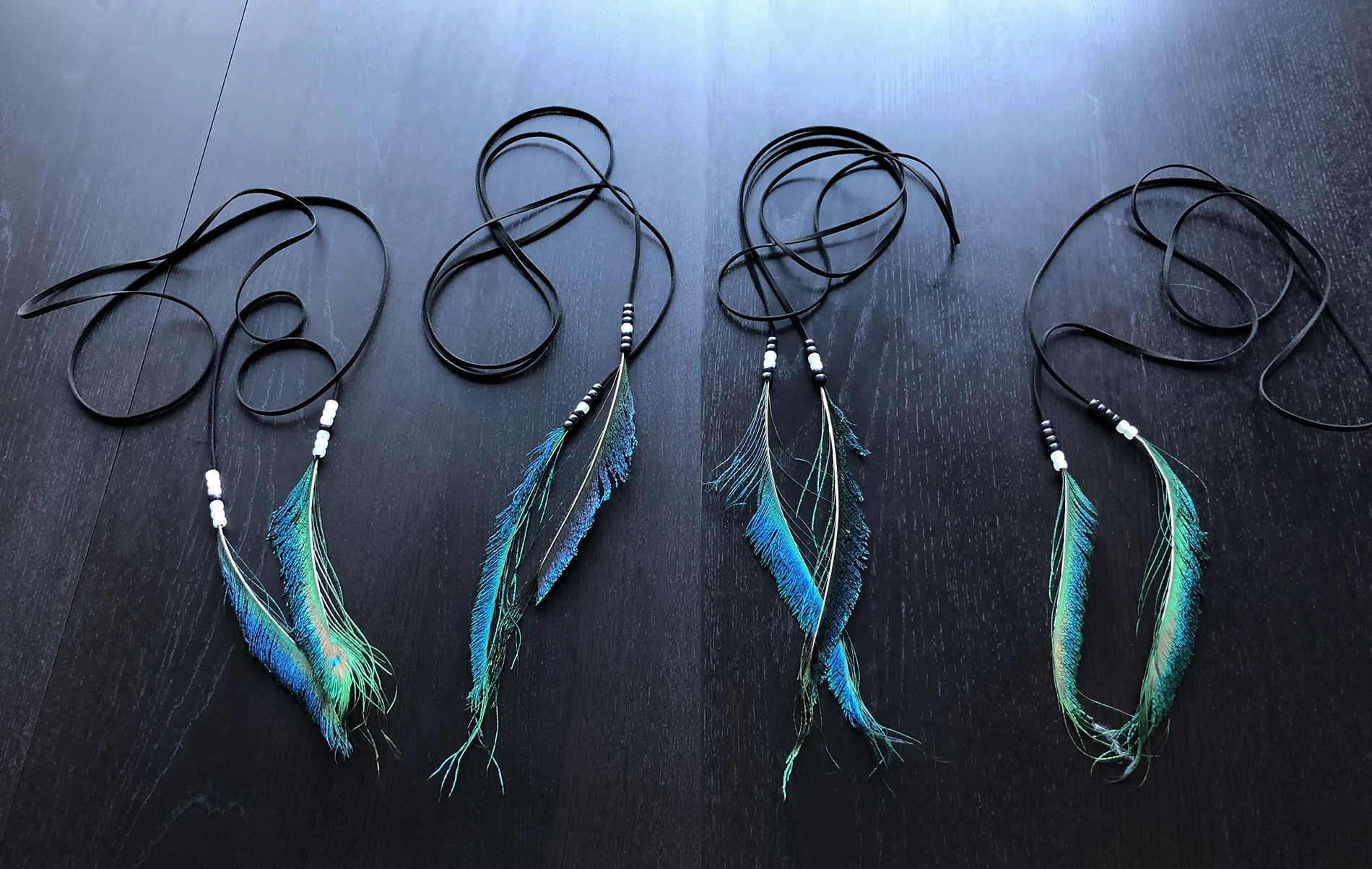 A new necklace idea! This one is quite long (about 70"), so it can be wrapped around the neck several times to desired length (wrap more for shorter necklace). Two iridescent peacock feathers are secured with black and white beads.